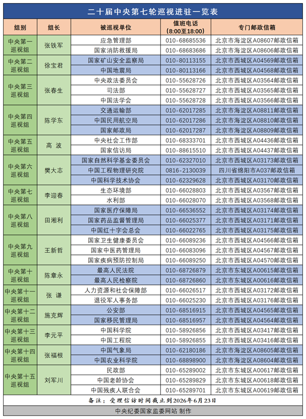 據悉,15個中央巡視組將在被巡視單位工作2個半月左右,巡視期間設立專門值班電話和郵政信箱,主要受理反映被巡視黨組織領導班子及其成員、下一級黨組織主要負責人問題的來信來電來訪,重點是關于違反政治紀律、組織紀律、廉潔紀律、群眾紀律、工作紀律、生活紀律等方面的舉報和反映。巡視組受理信訪時間截止到2026年6月23日。