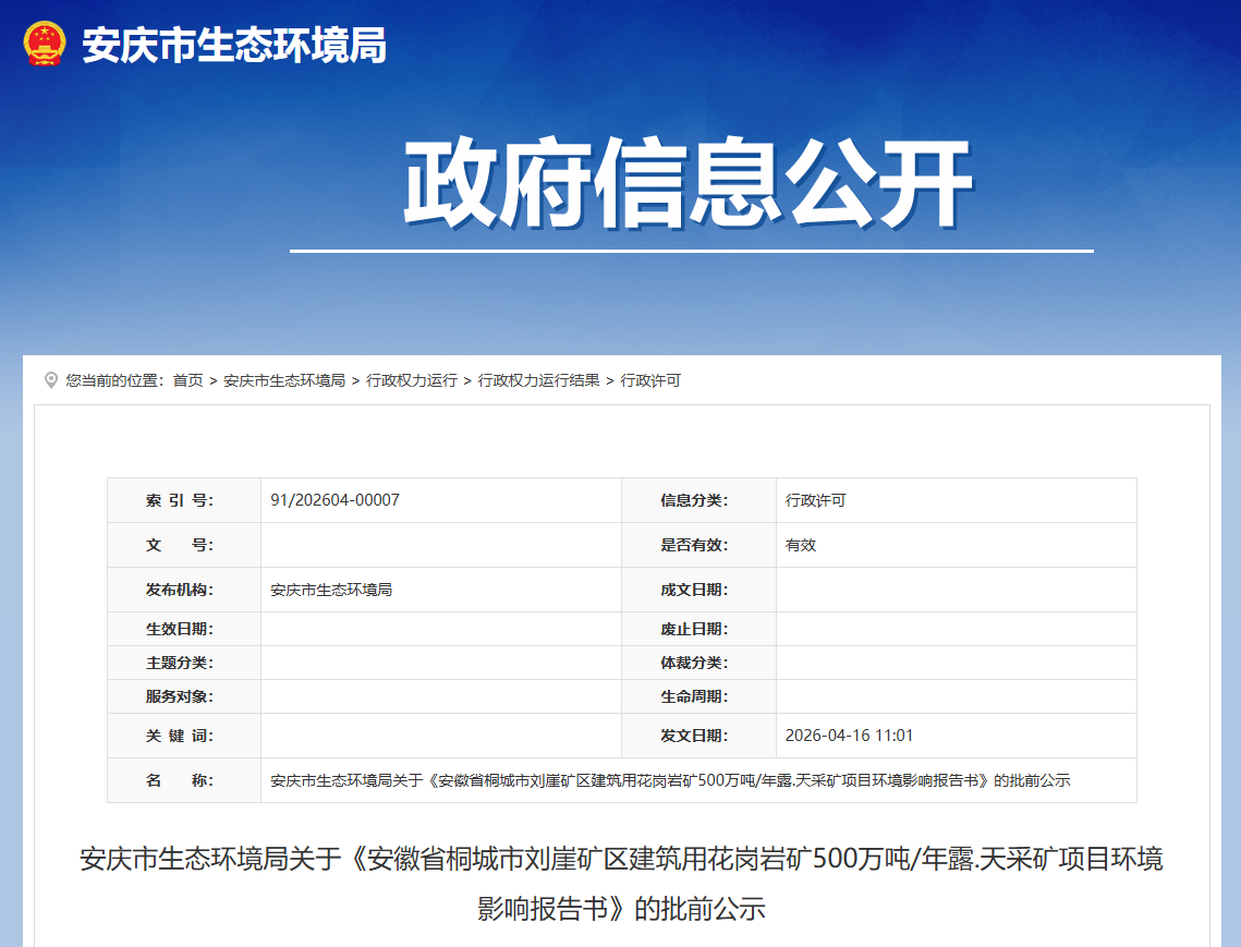 近日,安徽安慶市生態環境局發布《安徽省桐城市劉崖礦區建筑用花崗巖礦500萬噸/年露天采礦項目環境影響報告書》的批前公示,標志著該重點礦產項目建設邁出關鍵一步。 據悉,項目總投資達16.157億元,其中環??偼顿Y9865.98萬元,占工程總投資的6.11%。礦區可采資源量10073.31萬噸,擬出讓年限22.5年(含基建期2年),設計年開采規模500萬噸。該項目由桐城市同遠資源開發有限公司牽頭建設,新建年開采500萬噸建筑用花崗巖礦,配套建設約1公里運輸便道、排土場等附屬設施。該項目屬于安徽省2026年重點砂石項目之一,建成后將有效保障區域重點工程、重大項目及民生工程的石料供應需求。