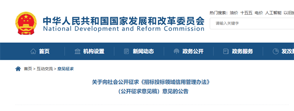近日,國家發展改革委發布《招標投標領域信用管理辦法(公開征求意見稿)》,面向社會公開征求意見,公開征求意見的時間為2026年4月17日至5月17日。社會各界可通過國家發展改革委門戶網站“互動交流”版塊“意見征求”專欄提交意見建議,共同推動招標投標領域信用體系規范化、法治化建設。
