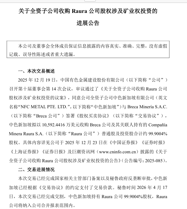 4 月 20日,中色股份發布公告確認:秘魯時間 4 月 17 日,公司全資子公司中色新加坡已完成對秘魯 Raura 公司 99.9004% 股權的收購交割,以1.06 億美元對價,將這座成熟在產的鋅多金屬礦正式納入麾下,標志著中色股份全球化礦產布局邁出關鍵一步,成功叩開南美礦業市場核心大門。