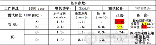 注:電機(jī)工作轉(zhuǎn)速為1490r/min,電機(jī)功率為355kW,測試儀器為SKF測振儀。