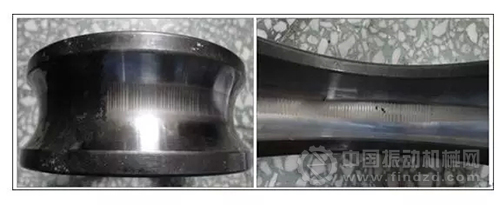 2012年8月23日下午,對油漿泵P201/2電機(jī)非軸伸端軸承進(jìn)行檢查,發(fā)現(xiàn)軸承內(nèi)、外圈滾道有條紋狀損傷(如圖6所示),局部觸摸有凹凸感。造成該損傷的原因有兩種:微振動和電蝕或放電。