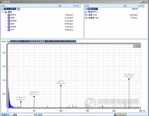 與頻譜圖對照,在振動頻譜圖中并沒有出現(xiàn)軸承故障頻率,但在沖擊脈沖頻譜圖中存在89、109、107Hz頻率,它們分別與軸承故障頻率外圈通過頻率(Fo)、內(nèi)圈通過頻率(Fi)、滾動體通過頻率(Fb)相對應(yīng),表明軸承內(nèi)外圈及滾動體存在缺陷。
