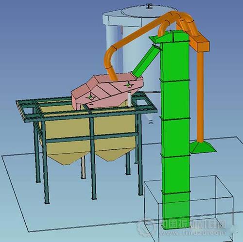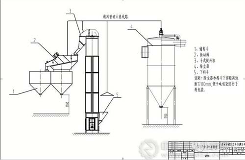 篩分系統(tǒng)圖中專門注明了除塵器下口和儲料斗下口距地面1700mm,因為要銷售的除塵粉全部要用噸包袋來包裝,而噸包袋的和叉車恰好適合這樣的高度哦。噸袋包裝同樣可以大大減少人工和地面的污染哦。