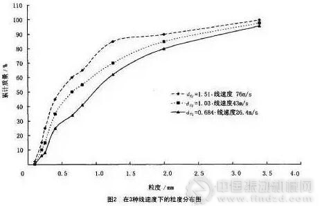 由圖2可知:線速度越高,物料成品的平均粒徑越小,100目( 0.15mm) 篩下物的超微粉比例越大。在線速度為26.4 m/s和 76.4m/s時,100目篩下物的超微粉比例分別為3.56%和8.24%,平均粒徑分別為 1.51 mm和 0.62 mm。