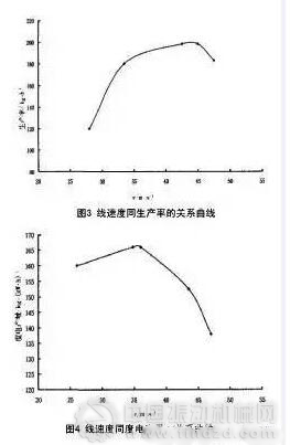 利用以上兩個關(guān)系式可計算出錘片末端線速度為 26.4~47 m/s 區(qū)間內(nèi)任一點的生產(chǎn)率和度電產(chǎn)量值,且經(jīng)求導(dǎo)數(shù)運算得出兩個極值點為最大生產(chǎn)率點 ( 42.6,197.7 ) 和最大度電產(chǎn)量點( 33. 8,166.8 ) , 曲線圖如圖3和圖4所示。