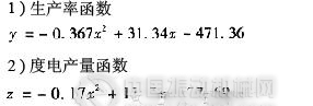 根據(jù)上述試驗數(shù)據(jù),并利用數(shù)值分析中牛頓二項式插值法,可擬合出錘片末端線速度同生產(chǎn)率和度電產(chǎn)量的二次關(guān)系式。