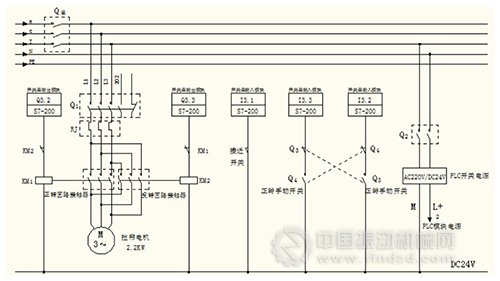 自動防呲包裝置電氣控制原理圖見下圖。從壓濾車間配電室引出三相電源作為壓濾機電氣系統(tǒng)的總電源Q總,將自動防呲包裝置的電氣系統(tǒng)接入壓濾機電氣系統(tǒng),使壓濾機總電源同時控制防呲包裝置總電源。主回路主要是控制拉簾電機的正轉(zhuǎn)和反轉(zhuǎn),從總電源引出主回路電機運行電源,接有電機電源開關(guān)Q1、電機正轉(zhuǎn)回路接觸器KM1和反轉(zhuǎn)回路接觸器KM2。控制回路電源同樣從總電源引出,接有回路電源開關(guān)Q2,為PLC開關(guān)電源及PLC模塊供電。防呲包裝置處于自動模式時,電機電控系統(tǒng)由系統(tǒng)PLC內(nèi)的脈沖計數(shù)器和計時器控制;防呲包裝置處于手動模式時,電機電控系統(tǒng)由手動按鈕控制。