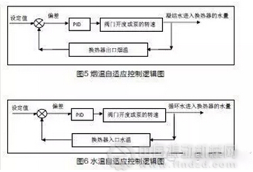 余熱利用的控制系統(tǒng)主要包括煙溫自適應(yīng)控制、水溫自適應(yīng)控制和吹灰控制。煙溫自適應(yīng)控制:每個(gè)換熱器出口各設(shè)兩個(gè)溫度測點(diǎn),通過調(diào)節(jié)閥門的開度或泵的轉(zhuǎn)速,控制凝結(jié)水進(jìn)入換熱器的水量與煙氣的熱交換,來實(shí)現(xiàn)煙溫的保持在恒定的范圍內(nèi)。煙溫自適應(yīng)控制邏輯圖見圖5。