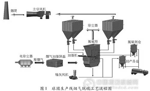工作原理:脫硫除塵一體化的密相塔半干法脫硫技術(shù)是一種以鈣基脫硫劑 CaO 為主的增濕類(lèi)煙氣脫硫技術(shù),細(xì)粉狀脫硫劑在加濕混合器內(nèi)加濕混合,水均勻分配到顆粒表面,加濕后的脫硫劑與 SO 2 在脫硫塔內(nèi)進(jìn)行脫硫反應(yīng)。球團(tuán)煙氣脫硫工藝流程如圖 1 所示。