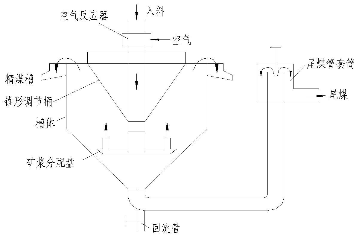IF浮選機為平底、圓柱形單槽式結構。工作原理為預處理后的礦漿進入槽體上部密閉的給料箱后形成垂直向下的煤漿液流;壓縮空氣從空心軸一端進入另一端排出,煤漿和空氣沿葉輪的葉片,由定子導向拋出,在攪拌、拋射和上升過程中氣泡完成礦化過程,并逐步上升至液面形成三相泡沫層,溢出后由槽體上部的溜槽排出,尾礦由底部中心的尾礦室排出。