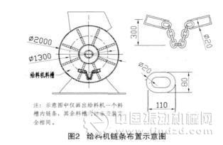 給料機料槽內加設鏈條,運轉時鏈條運動可松動原料,使粘到給料機料槽上粘土脫落。給料機寬度2000,在給料機寬度上均布10排鏈條,鏈條兩端用Ф20圓鋼與給料機料槽鋼板、鏈條焊接牢固;給料機直徑Ф2000,鏈條分布圓直徑Ф1300。每根鏈條長度要保證在鏈條安裝后能夠自然下垂300左右,以便鏈條能活動從而松動原料。