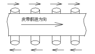 1.調(diào)整承載托輥組。皮帶機(jī)的皮帶在整個(gè)皮帶運(yùn)輸機(jī)的中部跑偏時(shí)可調(diào)整托輥組的位置來(lái)調(diào)整跑偏;在制造時(shí)托輥組的兩側(cè)安裝孔都加工成長(zhǎng)孔,以便進(jìn)行調(diào)整。具體調(diào)整方法見圖1。具體方法是皮帶偏向哪一側(cè),托輥組的哪一側(cè)朝皮帶前進(jìn)方向前移,或另外一側(cè)后移。如圖1所示皮帶向上方向跑偏,則托輥組的下位處應(yīng)當(dāng)向左移動(dòng),托輥組的上位處向右移動(dòng)。