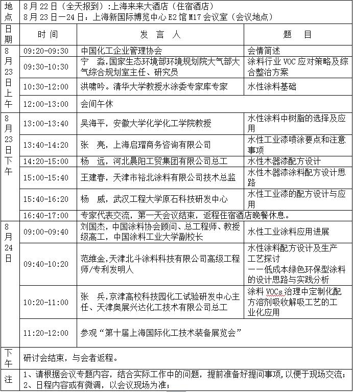 據(jù)統(tǒng)計,出席會議的演講嘉賓來自中國石油和化學工業(yè)聯(lián)合會、中國化工企業(yè)管理協(xié)會、中國涂料工業(yè)協(xié)會、國家生態(tài)環(huán)境部環(huán)境規(guī)劃院、中國科學院大連化學物理研究所、清華大學、上海交通大學、同濟大學、北京化工大學、南京工業(yè)大學、河北工業(yè)大學、浙江工業(yè)大學、安徽大學、麥肯錫、杜邦、LG化學、美國科式、博天環(huán)境等行業(yè)權威組織、科研機構、著名高校及知名企業(yè)。50多位資深專家將為行業(yè)帶來最新理念、前沿信息及技術解決方案。