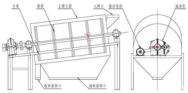 在日常生活中,我們常見的諸如直線振動篩、圓形振動篩的篩面都是水平的,而滾筒式振動篩的篩面則由若干個圓筒形篩網(wǎng)組成,整體與地平面成傾斜狀態(tài),并為了防止污染物料和環(huán)境采取全封閉或半封閉的結(jié)構(gòu)設(shè)計(jì),通常情況下,滾筒式振動篩在篩分過程中可通過梳形清篩機(jī)構(gòu)與篩分筒的相對運(yùn)動,達(dá)到對篩體不問斷清理的效果,使篩分筒在整個工作過程中始終保持清結(jié)、不粘、不堵、不影響篩分效果。