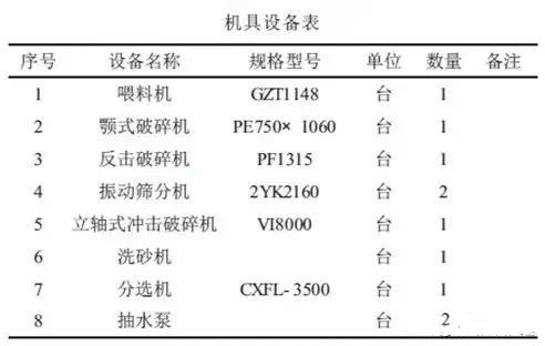 碎石生產(chǎn)加工設(shè)備,毛料經(jīng)山體爆破開采,棒條式喂料機(jī)給料,初破顎式破碎機(jī),二破反擊破碎機(jī),振動篩篩分,立軸式?jīng)_擊破碎機(jī),分選機(jī)(濕法制砂用輪斗式或螺旋式洗砂機(jī)),以碎石生產(chǎn)能力200t/h,機(jī)制砂150t/h,其設(shè)備配置如下表所列: