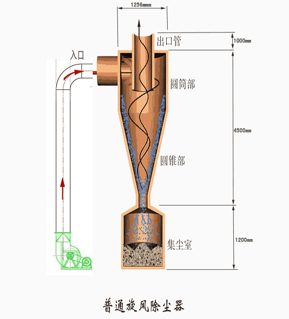 使含塵氣流做旋轉(zhuǎn)運(yùn)動(dòng)形成內(nèi)升外降雙層氣旋,借助于離心力將塵粒從氣流中分離并捕集于器壁,再借助重力作用使塵粒落入灰斗。