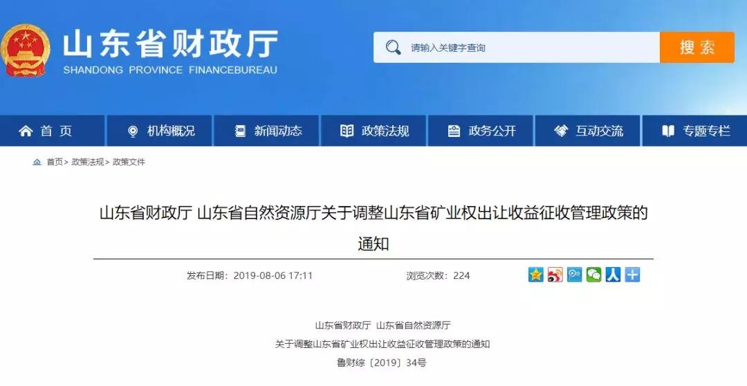 山東省財政廳 山東省自然資源廳關(guān)于調(diào)整山東省礦業(yè)權(quán)出讓收益征收管理政策的通知