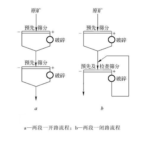 破碎段是破碎流程的最基本單元。破碎段數(shù)不同及破碎機(jī)和篩子的組合不同,便有不同的破碎篩分流程。需要的破碎段數(shù)取決于給料中的最大塊度和要求的最終破碎產(chǎn)物粒度,以及各破碎段所能達(dá)到的破碎比。