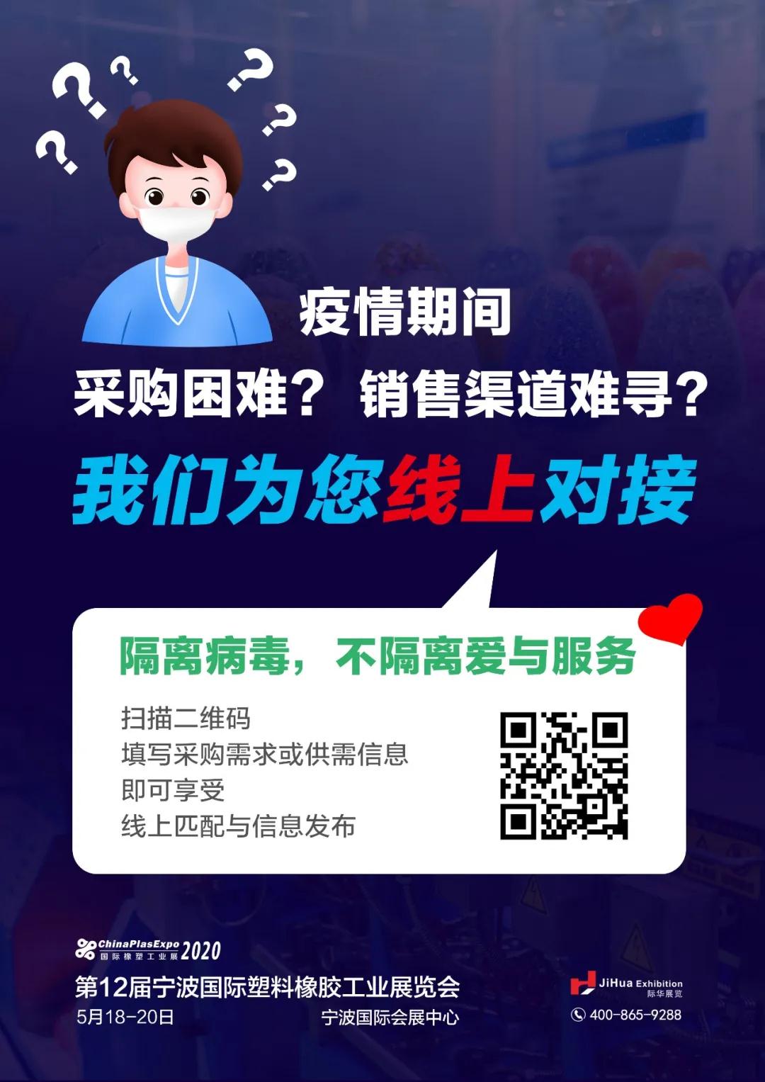 病毒無情,人間有愛。我們共同擔(dān)當(dāng),共度時艱。疫情期間為解決企業(yè)采購困難,銷售渠道受阻等問題,寧波橡塑展積極發(fā)揮資源集中優(yōu)勢,為企業(yè)提供線上供需進(jìn)行對接平臺,免費為供、需雙方提供對接服務(wù)。