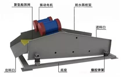 脫水篩主要作用是脫水、脫泥、脫介,設(shè)備低傾角大直線振動,結(jié)合電磁振網(wǎng)清理篩網(wǎng)上的砂子,砂從篩上排出,水從篩下排入尾礦泵槽。