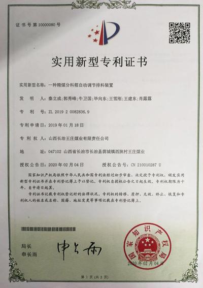 為積極響應集團公司節(jié)能降耗總體要求,實現(xiàn)“應洗盡洗,顆粒歸企”的選煤宗旨,近日,王莊煤業(yè)通過多次改造試驗,成功研發(fā)出“一種精煤分料自動調節(jié)排料裝置”,并喜獲國家實用新型專利證書,專利號為ZL201920082836.9。