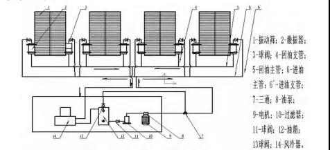 啟動(dòng)電機(jī)帶動(dòng)油泵,機(jī)油由油箱流出通過過濾器(10)和三通(7)及進(jìn)油主管和進(jìn)油支管線進(jìn)入八臺(tái)激振器進(jìn)油孔,機(jī)油進(jìn)入激振器的內(nèi)腔后,軸承得到充分潤滑,然后通過回油孔沿回油支管和主管線流入油箱內(nèi),依次循環(huán)工作。