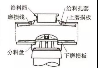 上磨損板非正常磨損主要因給料筒及給料孔套磨損嚴(yán)重,需有針對(duì)性的檢查給料筒及給料孔套的磨損情況并進(jìn)行更換(上磨損板內(nèi)側(cè)邊緣磨損至3mm時(shí)更換),同時(shí)觀察轉(zhuǎn)子拋料頭磨損位置,確定是否受導(dǎo)料板安轉(zhuǎn)位置和安裝角度影響。