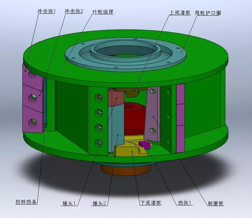 立軸式?jīng)_擊破碎機(jī)轉(zhuǎn)子主要由轉(zhuǎn)子本體、分料盤、給料孔套、導(dǎo)料板、上磨損板、下磨損板以及頂部磨損板等部件組成。