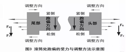 調(diào)整方法:假如輸送帶在機(jī)頭卸載滾筒處跑偏,則輸送帶往哪邊跑偏就將哪邊的滾筒軸沿輸送帶運(yùn)行方向前調(diào)一小段距離,可通過調(diào)節(jié)滾筒兩側(cè)軸承的調(diào)節(jié)螺栓來進(jìn)行;假如輸送帶在機(jī)尾改向滾筒處跑偏,則應(yīng)把輸送帶跑松側(cè)滾筒沿回空輸送帶運(yùn)行方向前移(用調(diào)節(jié)螺栓調(diào)整)。
