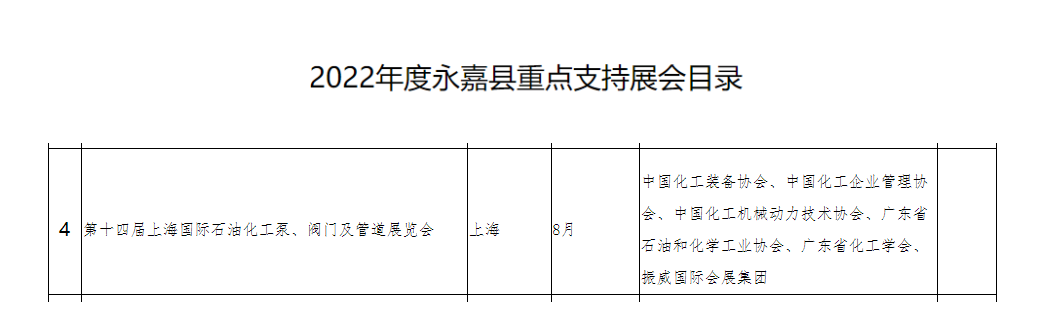 近年來,主辦方不斷整合各方資源,展會(huì)還得到政府的高度支持。3月14日,溫州市永嘉縣商務(wù)局發(fā)布《2022年永嘉縣重點(diǎn)支持展會(huì)目錄》,以支持企業(yè)走出去拓展市場,激發(fā)本土?xí)菇?jīng)濟(jì)活力,促進(jìn)商務(wù)經(jīng)濟(jì)高質(zhì)量發(fā)展,第十四屆上海國際化工泵、閥門及管道展覽會(huì)名列其中。