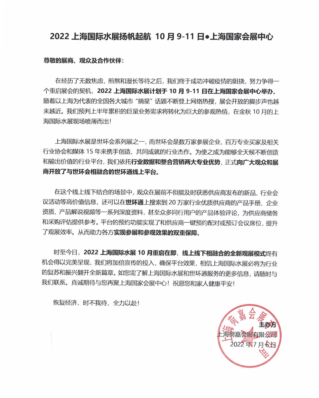“疫”別多日,全力以“復(fù)”丨2022上海國(guó)際水展定檔10月