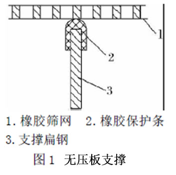 3、安裝中存在的問(wèn)題(1)大多的篩分設(shè)備制造廠(chǎng),在制造篩子時(shí),為了提高有效篩分面積,都把篩網(wǎng)的支撐梁設(shè)計(jì)成一根側(cè)立的鋼板,再在鋼板上壓一塊或襯一塊橡膠保護(hù)條(如圖1所示)。由于支撐梁太小,所以上面沒(méi)法再加裝壓板。