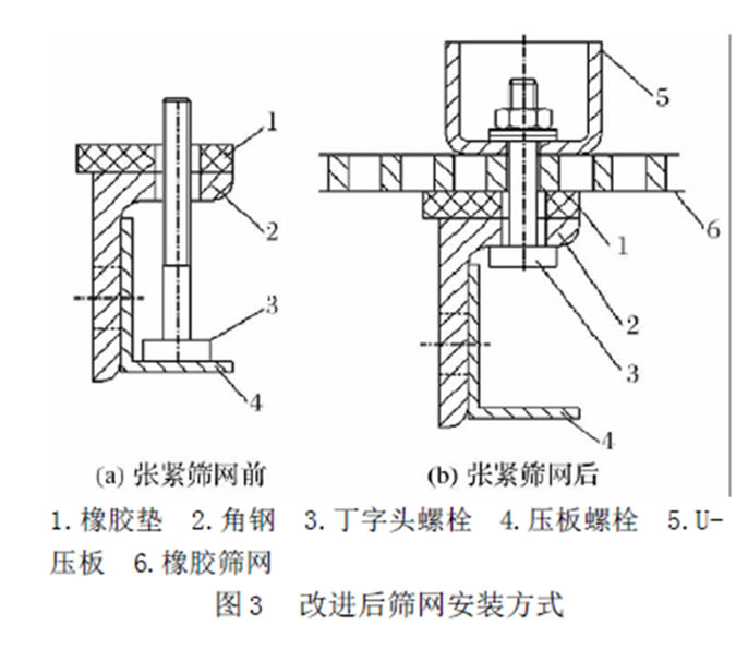 (1)將支撐梁(扁鋼)改為角鋼,再在角鋼上表面襯膠,減少篩網(wǎng)與角鋼的剛性接觸;