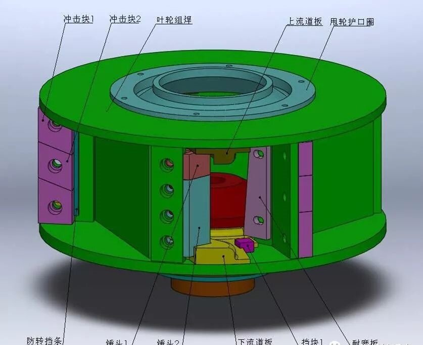 連續(xù)不斷的物料進入高速旋轉的葉輪,加速后形成了源源不斷地動力料流,在渦動腔內產生高速擠壓、研磨破碎,得到連續(xù)破碎生產。從立軸式沖擊破碎機工作原理可知,當物料粒徑大小已確定時,隨著破碎機轉子線速度的增高,動能增加很大;當破碎機轉子線速度衡定時,若物料質量增大,動能亦隨之增加,反之亦然。