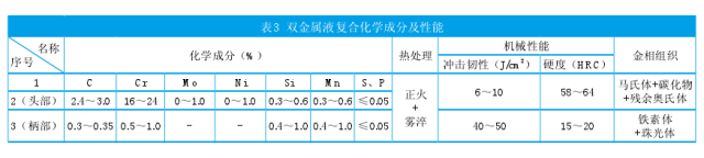 為了解決單一材料韌性和硬度之間的矛盾,提高錘頭的抗磨性能,開發(fā)了一種新型抗磨材料 - 雙金屬液體熱復(fù)合錘頭?;瘜W(xué)成分和性能如表3所示。雙金屬液熱復(fù)合鑄造生產(chǎn)工藝用于成功地將高鉻合金鑄鐵(錘擊工件)與高硬度和鑄鋼(錘頭)相結(jié)合,具有良好的韌性和可加工性。使用單一金屬材料難以實現(xiàn)的優(yōu)異耐磨性和抗沖擊性的整體綜合性能。