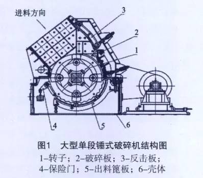 水泥廠使用的大部分石灰石是露天爆破,原始塊體尺寸非常大(500~1)。 500mm),通過叉車或裝載機(jī)倒入筒倉,通過鏈?zhǔn)捷斔蜋C(jī)輸送到破碎機(jī)進(jìn)料口,石灰石通過阻尼裝置落到進(jìn)料輥上,兩個相同方向旋轉(zhuǎn)的進(jìn)料輥將石灰石進(jìn)入轉(zhuǎn)子高速旋轉(zhuǎn)。錘子以更高的線速度(30-50 m/s)撞擊石灰石,同時壓碎或拋出塊體,拋出的塊撞擊反擊板或碰撞并再次破碎,然后錘頭進(jìn)入破碎板和卸料筏的工作區(qū)域繼續(xù)被擊打和壓碎,直至小于絎縫尺寸(套筒25~75mm),并從機(jī)腔下部排出,材料壞了。該比例高達(dá)1:20至1:60,表明大型石灰石破碎機(jī)的工作條件非常差。
