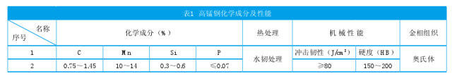 近年來,通過在普通高錳鋼(Mn13)的標(biāo)準(zhǔn)組成的基礎(chǔ)上增加碳和錳的含量,開發(fā)了超高錳鋼。將錳含量(質(zhì)量分?jǐn)?shù))增加至14%至18%,并添加1%至3%的Cr和適量的Ti,V,Mo等合金強(qiáng)化元素。化學(xué)成分和性能如表2所示。超高錳鋼比普通高錳鋼具有更好的變形強(qiáng)化能力(加工硬化率)。在相同形狀變量下,超高錳鋼比普通高錳鋼具有更高的變形硬度。如果變形為20%,普通高錳鋼的變形硬度約為360HB,超高錳鋼的變形硬度為400HB。超高錳鋼的使用壽命是普通高錳鋼在磨損或強(qiáng)沖擊和高壓下的鑿磨損方面的1.5至2倍。