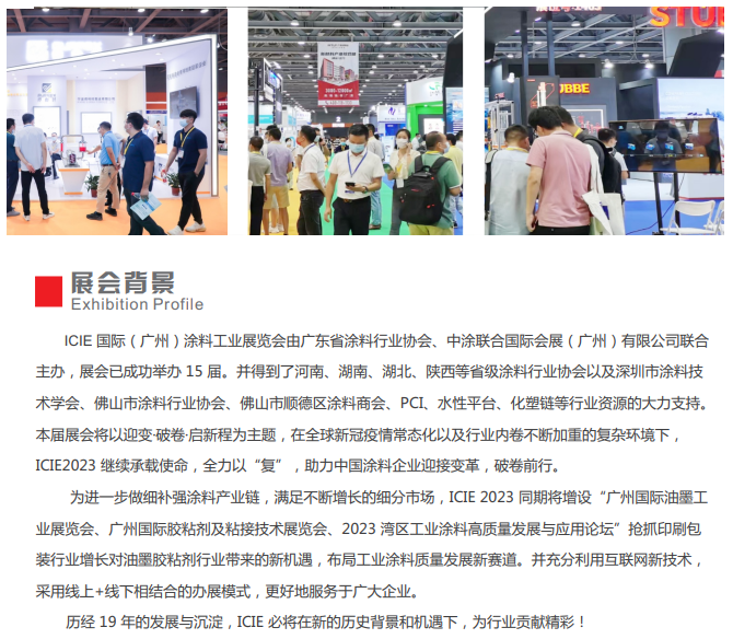 由廣東省涂料行業(yè)協(xié)會(huì)、中涂聯(lián)合國(guó)際會(huì)展(廣州)有限公司聯(lián)合主辦2023國(guó)際(廣州)涂料工業(yè)展覽會(huì)暨涂料原料選料大會(huì)將于6月14-16日在廣州保利世貿(mào)博覽館舉辦,為搭建更高質(zhì)量的行業(yè)交流平臺(tái),ICIE 2023組委會(huì)宣傳推廣和招展招商各項(xiàng)工作正穩(wěn)步推進(jìn)。