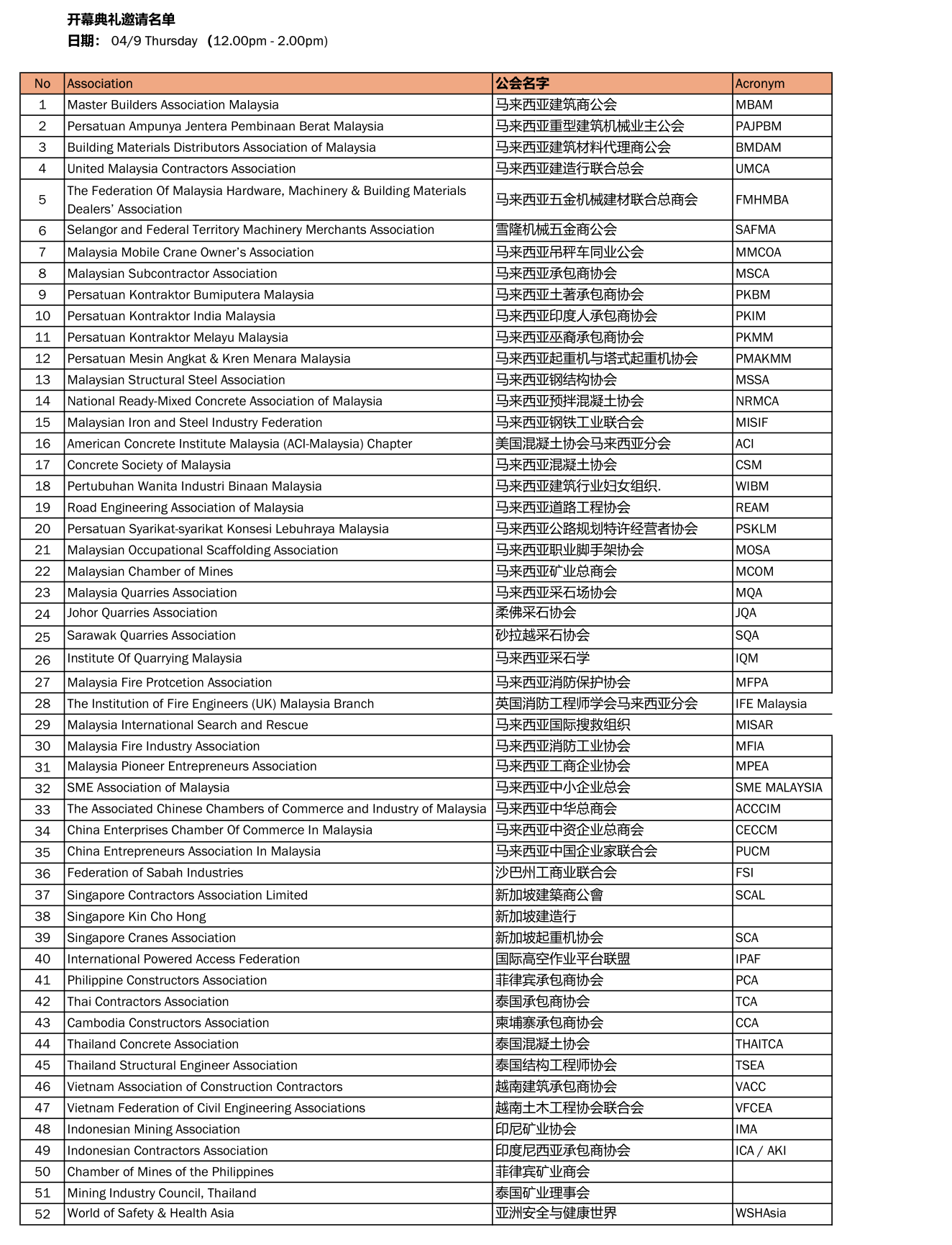 馬來西亞建筑商協(xié)會(huì);馬來西亞重型建筑機(jī)械業(yè)主公會(huì);馬來西亞建筑材料代理商協(xié)會(huì);馬來西亞建造行聯(lián)合總會(huì);馬來西亞五金機(jī)械建材聯(lián)合總商會(huì);雪隆機(jī)械五金商公會(huì);馬來西亞吊秤車同業(yè)公會(huì);馬來西亞承包商協(xié)會(huì);馬來西亞土著承包商協(xié)會(huì);馬來西亞印度人承包商協(xié)會(huì);馬來西亞巫裔承包商協(xié)會(huì);馬來西亞起重機(jī)與塔式起重機(jī)協(xié)會(huì);馬來西亞鋼結(jié)構(gòu)協(xié)會(huì);馬來西亞預(yù)拌混凝土協(xié)會(huì);馬來西亞鋼鐵工業(yè)聯(lián)合會(huì);美國(guó)混凝土協(xié)會(huì)馬來西亞分會(huì);馬來西亞混凝土協(xié)會(huì);馬來西亞建筑行業(yè)婦女組織;馬來西亞道路工程協(xié)會(huì);馬來西亞公路規(guī)劃特許經(jīng)營(yíng)協(xié)會(huì);馬來西亞職業(yè)腳手架協(xié)會(huì);馬來西亞礦業(yè)總商會(huì);馬來西亞采石場(chǎng)協(xié)會(huì);柔佛采石協(xié)會(huì);砂拉越采石協(xié)會(huì);馬來西亞采石學(xué)會(huì);馬來西亞消防保護(hù)協(xié)會(huì);英國(guó)消防工程師學(xué)會(huì)馬來西亞分會(huì);馬來西亞國(guó)際搜救組織;馬來西亞消防工業(yè)協(xié)會(huì);馬來西亞工商業(yè)協(xié)會(huì);馬來西亞中小企業(yè)總會(huì);馬來西亞中華總商會(huì);馬來西亞中資企業(yè)總商會(huì);馬來西亞中國(guó)企業(yè)家聯(lián)合會(huì);沙巴州工商聯(lián)聯(lián)合會(huì);新加坡建筑商協(xié)會(huì);新加坡建造行;新加坡起重機(jī)協(xié)會(huì);國(guó)際高空作業(yè)平臺(tái)聯(lián)盟;菲律賓承包商協(xié)會(huì);泰國(guó)承包商協(xié)會(huì);柬埔寨承包商協(xié)會(huì);泰國(guó)混凝土協(xié)會(huì);泰國(guó)結(jié)構(gòu)工程師協(xié)會(huì);越南建筑承包商協(xié)會(huì);越南土木工程協(xié)會(huì)聯(lián)合會(huì);印尼礦業(yè)協(xié)會(huì);印度尼西亞承包商協(xié)會(huì);菲律賓礦業(yè)商會(huì);泰國(guó)礦業(yè)理事會(huì);亞洲安全與健康世界。