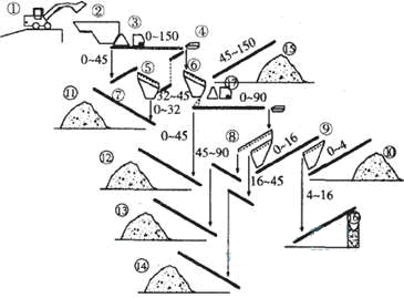 1-載荷車;2-料斗;3-主破碎機(jī);4-鐵件收料臺(tái);5-初篩分機(jī);6-分篩機(jī)Ⅰ;7-輸送帶;8-分篩機(jī)Ⅱ;9-分篩機(jī)Ⅲ;10-0~4mm粒徑骨料;11-0~32mm粒徑骨料;12-0~45mm粒徑骨料;13-45~90mm粒徑骨料;14-16~45mm粒徑骨料;15-45~150mm粒徑骨料;16-4~16mm粒徑骨料;17-破碎機(jī)
