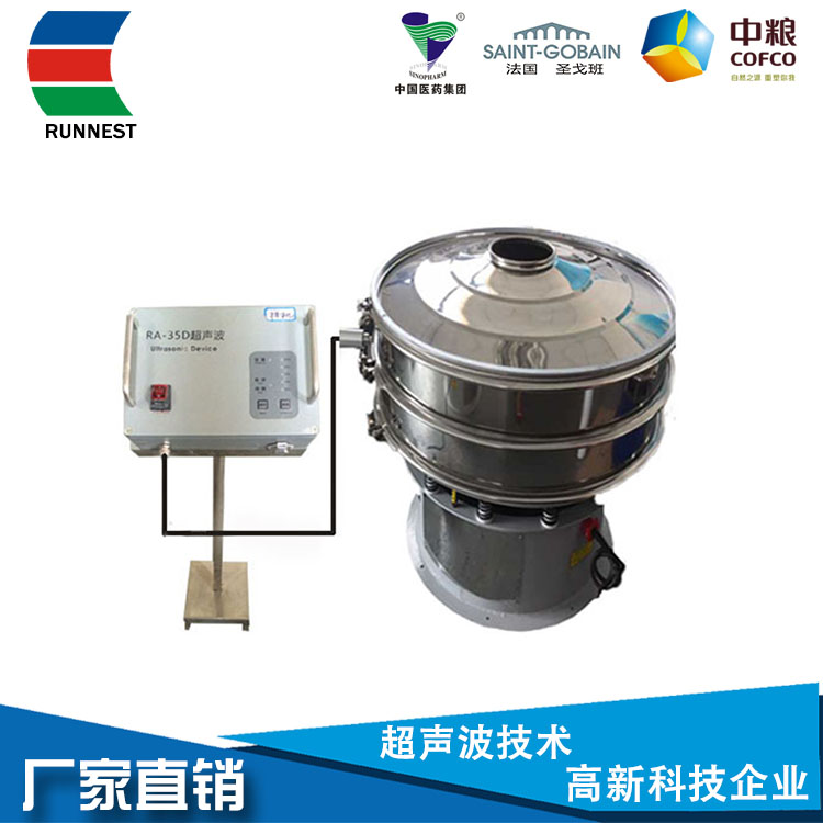附加在RA系列超聲波振動篩篩網(wǎng)上的超聲振動波(機械波),使超微細(xì)粉體接受巨大的超聲加速度,從而抑制粘附、摩擦、平降、楔入等堵網(wǎng)因素,提高篩分效益和清網(wǎng)效益。