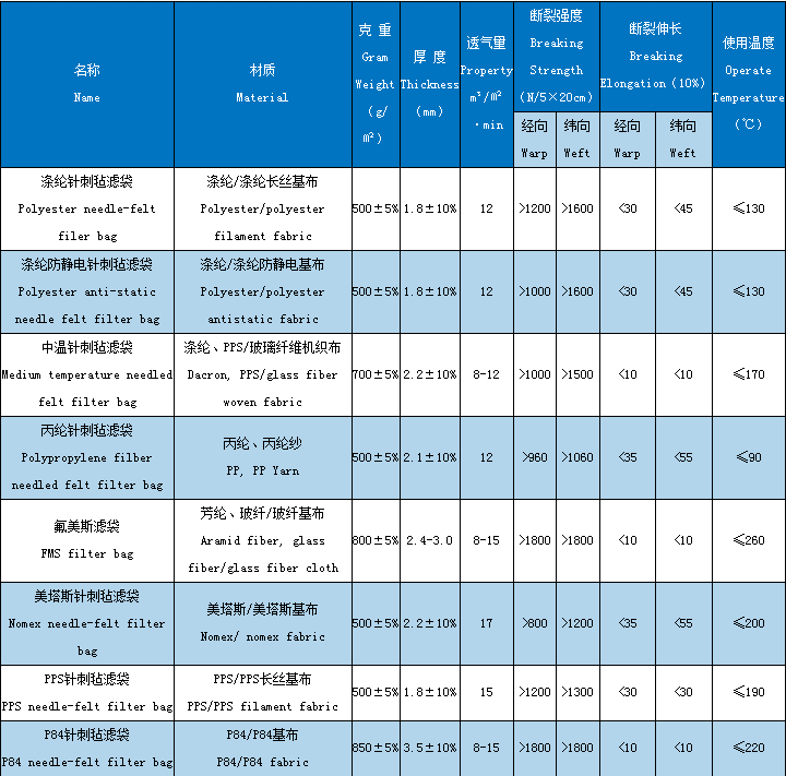 濾料用纖維,有棉纖維、毛纖維、合成纖維以及玻璃纖維等,不同纖維織成的濾料具有不同性能。常用的濾料有208或901滌輪絨布,使用溫度一般不超過120℃,經(jīng)過硅硐樹脂處理的玻璃纖維濾袋,使用溫度一般不超過250℃,棉毛織物一般適用于沒有腐蝕性;溫度在80-90℃以下含塵氣體。