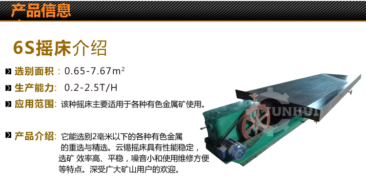 6-S搖床(6-S shaking table)是用于選別細(xì)粒物料的重力選礦設(shè)備,廣泛應(yīng)用于選別錫、鎢、金銀、鉛、鋅、鉭、鈮、鐵、錳、鈦鐵和煤等。
