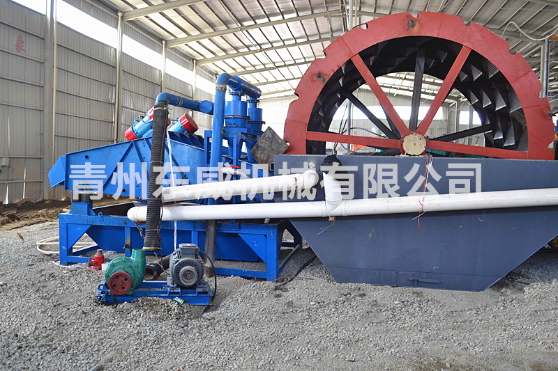 洗砂機是砂石(人工沙、天然沙)的洗選設(shè)備。洗砂機廣泛用于砂石場、礦山、建材、交通、化工、水利水電、混凝土攪拌站等行業(yè)中對物料的洗選。它能除去覆蓋砂石表面的雜質(zhì),同時破壞包覆砂粒的水汽層,以利于脫水,起到高效洗砂清洗作用。洗砂機工作時,電機通過三角帶、減速機、齒輪減速后帶動葉輪緩慢轉(zhuǎn)動。砂子從洗砂機的進料端進入到水洗槽中,在葉輪的帶動下砂子和水輪互相研磨,從而達到除去覆蓋砂石表面的雜質(zhì),并破壞包覆砂粒的水汽層,以利于脫水;同時加水,形成強大水流,及時將雜質(zhì)及比重小的異物帶走,并從溢出口洗槽排出,完成清洗作用。我公司輪斗洗砂機采用鋼板沖孔網(wǎng)、弧形的輪斗斗形,顯著提高輪斗洗砂機的脫水效果,用戶可以在輪斗出料端加裝高壓清水噴淋,將洗出的沙子表面的臟水進行重新沖洗,可以顯著提高砂子的清潔度。