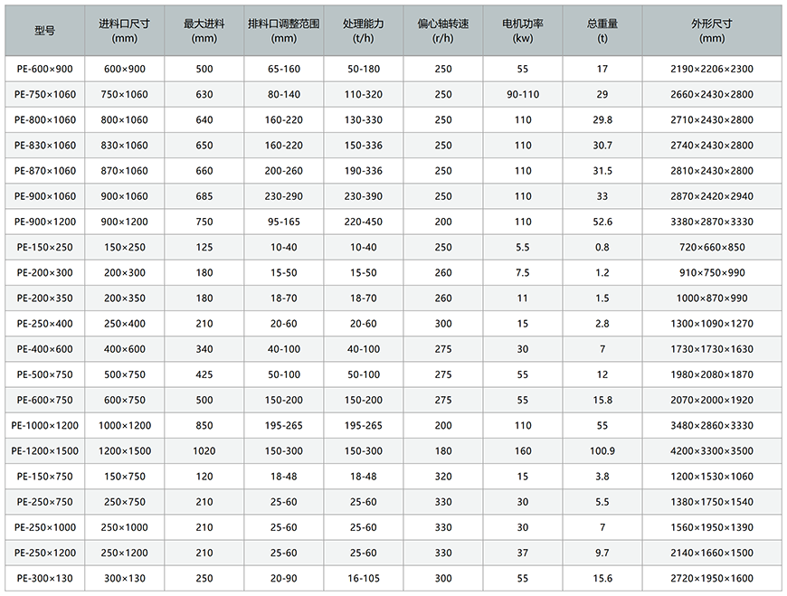 顎式破碎機主要由機架、偏心軸、大皮帶輪、飛輪、側護板、肘板、肘板后座、調隙螺桿、復位彈簧、固定顎板與活動顎板等組成。顎式破碎機破碎方式為曲動擠壓型。工作時,電動機驅動皮帶和皮帶輪,通過偏心軸使動顎上下運動,當動顎上升時,肘板和動顎間夾角變大,從而推動動顎板向定顎板接近,物料通過兩顎板之間的擠壓、搓、碾等實現(xiàn)多重破碎;當動顎下行時,肘板和動顎間夾角變小,動顎板在拉桿、彈簧的作用下離開定顎板,已破碎物料在重力的作用下,經(jīng)顎腔下部的出料口自由卸出。隨著電動機的連續(xù)轉動,動顎做周期性的壓碎和排料,實現(xiàn)批量生產(chǎn)。