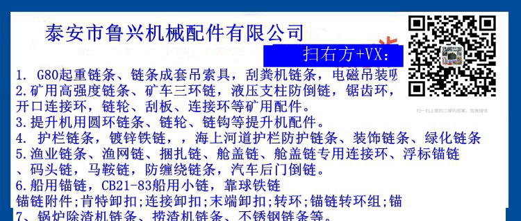 • 主營產(chǎn)品:鍍鋅鏈條、護(hù)欄鏈條,G80起重鏈條,船用錨鏈,礦用高強(qiáng)度鏈條、提升機(jī)用圓環(huán)鏈條、撈渣機(jī)鏈條、漁網(wǎng)鏈、捆扎鏈、艙蓋鏈,刮糞機(jī)鏈條,吸盤鏈條,CB21-83船用小鏈,鋸齒環(huán),弧齒環(huán),開口連接環(huán),鏈輪