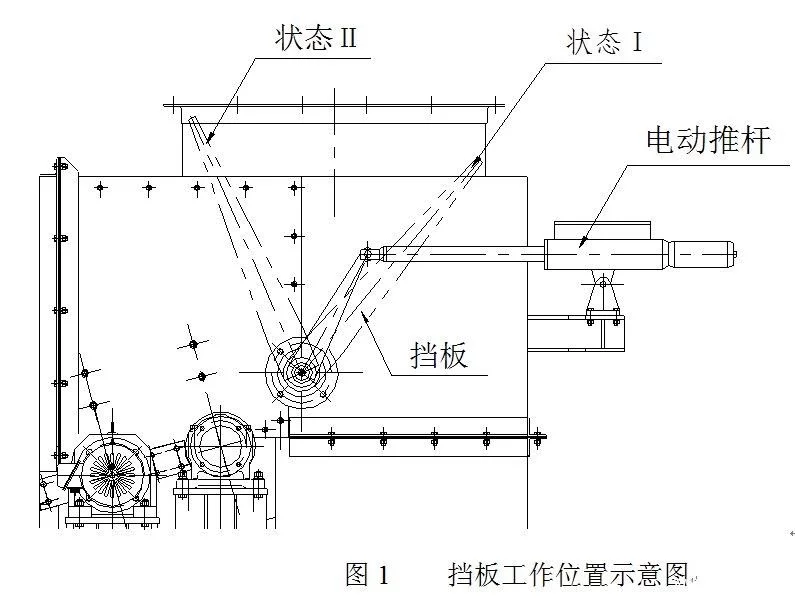 5、在機(jī)內(nèi)入口處設(shè)有用電動(dòng)(液)推桿切換的擋板, 可在滾軸篩檢修時(shí)使煤料直接進(jìn)入下層皮帶而不影響系統(tǒng)的運(yùn)行;煤擋板置于入料口的下方,設(shè)備在工作狀態(tài)時(shí)擋板處于狀態(tài)Ⅰ的位置;當(dāng)煤的粒度≤30mm不須篩分或設(shè)備出現(xiàn)故障而輸煤線不能停機(jī)時(shí),可啟動(dòng)電動(dòng)(液)推桿將煤擋板轉(zhuǎn)到狀態(tài)Ⅱ的位置,這時(shí)煤流可直接落入下游運(yùn)輸皮帶中。擋板用耐磨鋼板制作而成,有均勻布料功能,使煤料均勻平鋪在整個(gè)篩面上,起到更好的篩分效果。