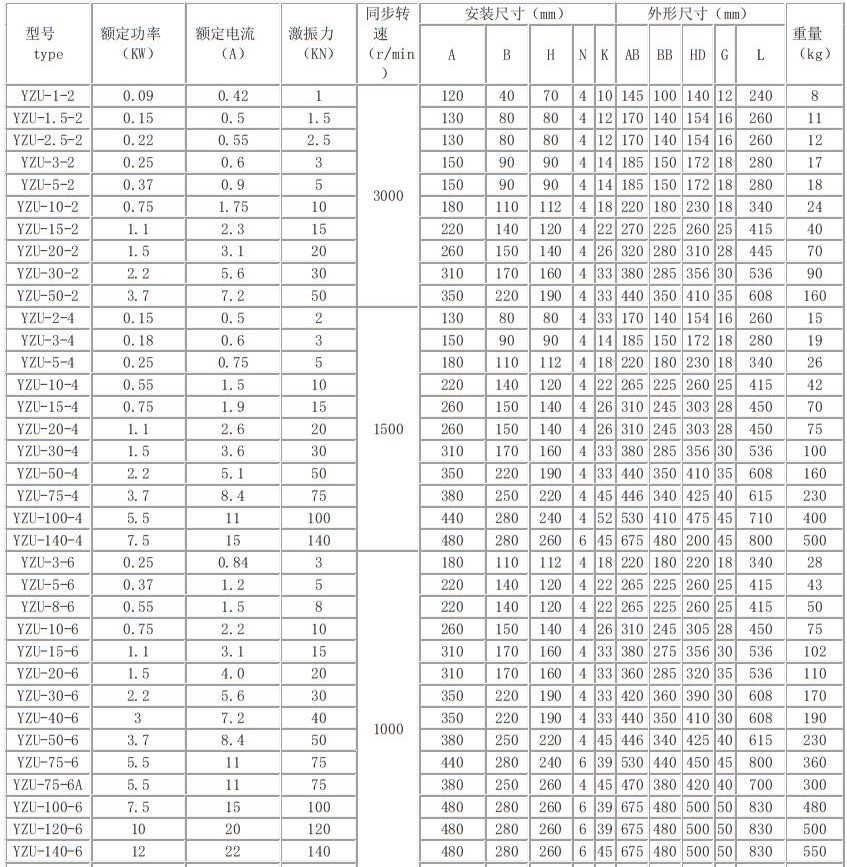 YZU-15-2振動(dòng)電機(jī)外形安裝尺寸及技術(shù)參數(shù):