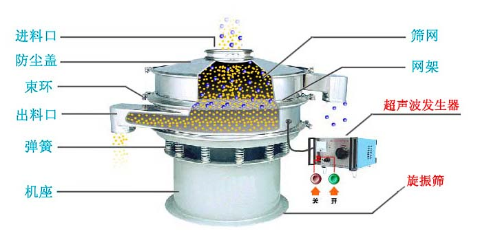 超聲波篩分系統(tǒng)由超聲波諧振電源、振蕩器、共振環(huán)組成。超聲波諧振電源產(chǎn)生的高頻電振蕩由振蕩器轉(zhuǎn)換成高頻振蕩波,這些振蕩波傳到共振環(huán)上使共振環(huán)產(chǎn)生共振,然后由共振環(huán)將振動(dòng)均勻傳輸至篩面。篩網(wǎng)上的物料在由振動(dòng)篩電機(jī)做低頻振動(dòng)的同時(shí),疊加上超聲波振動(dòng),這樣既可防止網(wǎng)孔堵塞,又可提高篩分產(chǎn)量和質(zhì)量。